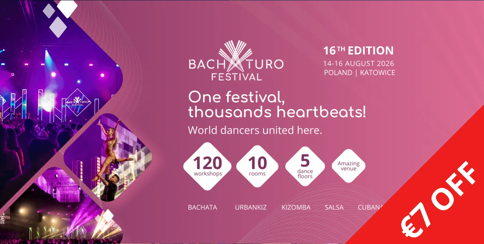 BACHATURO 2026 - We’re back! Early Birds start 3rd November! Hello Everyone ❤️ After a short break, we’re thrilled to announce the new edition of BACHATURO FESTIVAL 14-16 August 2026, Katowice (Poland)! Get ready for another unforgettable weekend filled with passion, music and thousands of heartbeats on one dance floor. EARLY BIRDS start on 3rd November 2025 at 20:00 (CET) Only 500 Fullpasses available at the special price - 120 EUR / 500 PLN Join dancers from all over the world for the 16th Edition of the most international Latin dance festival in Europe. Let’s make 2026 the most spectacular edition ever!...