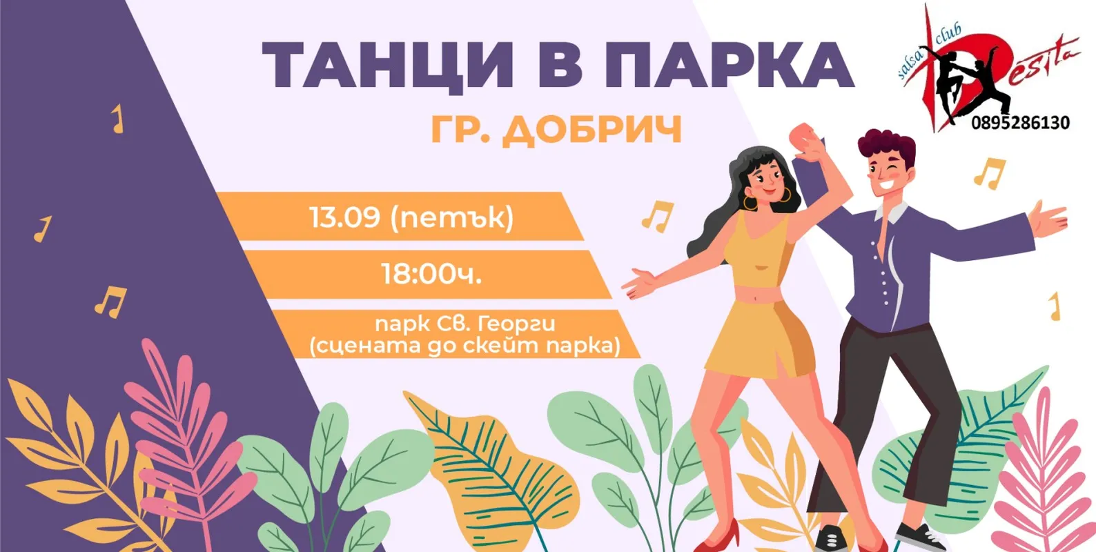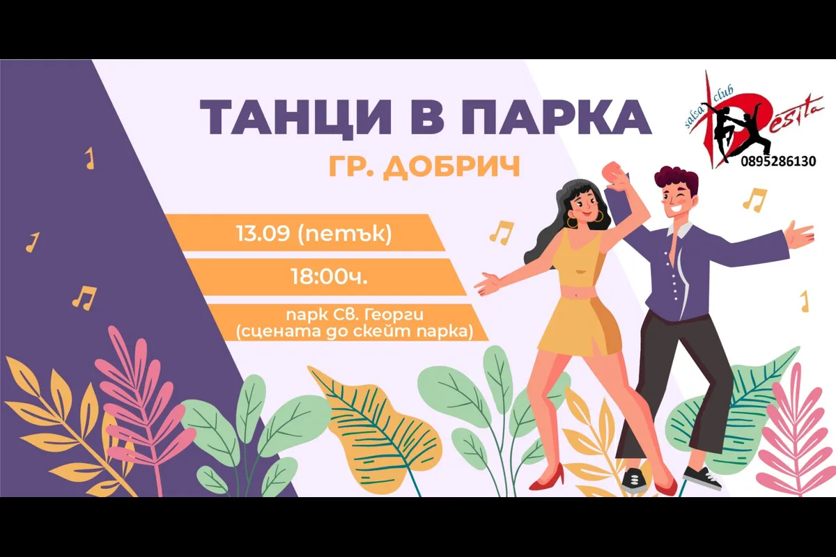Салса клуб "Десита" Ви кани на ТАНЦИ В ПАРКА! За пореден път в ДОБРИЧ, в прекрасния парк "Св. Георги" ще танцуваме под латино ритми. ОТ НАС музика, танци и забавление Салса клуб "Десита" школа за социални латино танци с над 16 годишна история, развиваща се до в момента в три областни града - Добрич, Варна и Шумен. ОТ ВАС големи усмивки, желание и най-вече присъствие. Защото ние сме тук, за да направим живота Ви още по-интересен! Очакваме Ви на 13 септември (Петък) от 18:00 часа в парк "Св. Георги" (сцената до скейт парка). С любезното съдействие на Община Добрич. Не пропускайте! ...